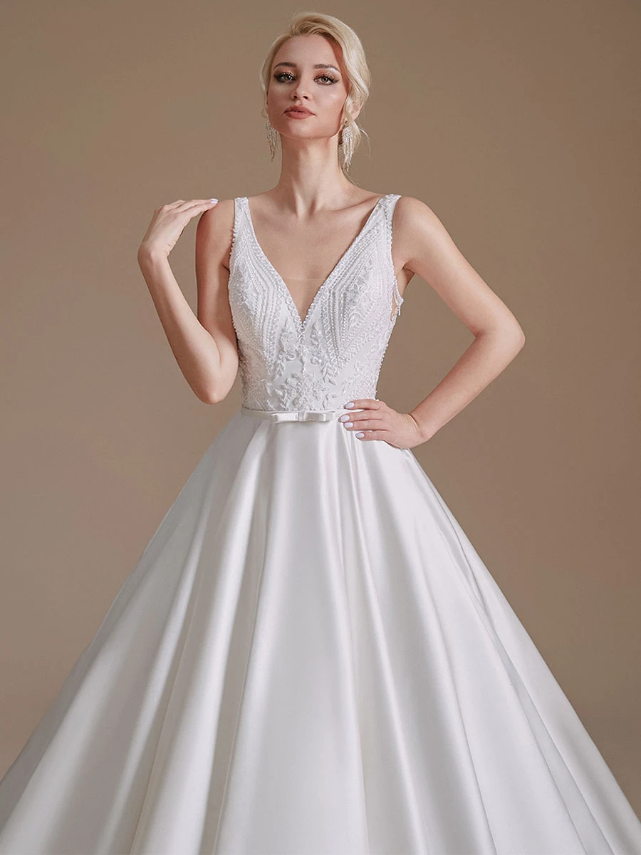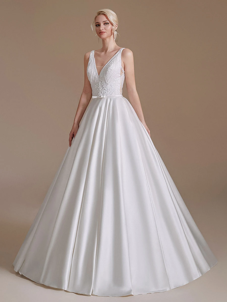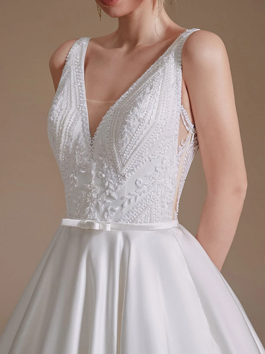 A-line Wedding Dresses Floor-Length Sleeveless Lace V-Neck Bridal Gowns Free Customization