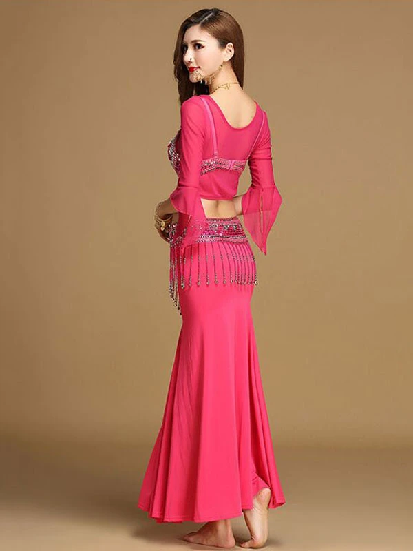 Belly Dance Costumes Women Rose Red Beading High Slit Belly Dancing Performance Costume Halloween