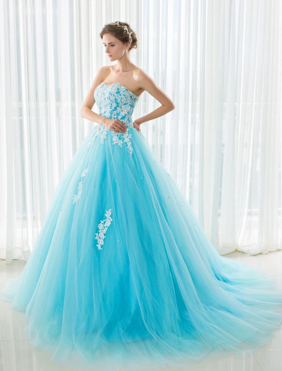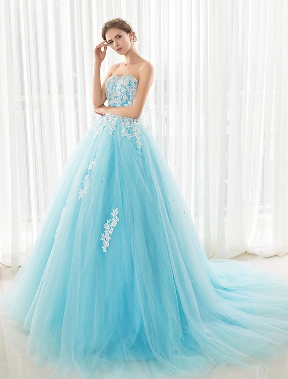 Blue Wedding Dress Lace Applique Tulle Court Train Strapless Sweetheart Lace-Up A-Line Bridal Gown