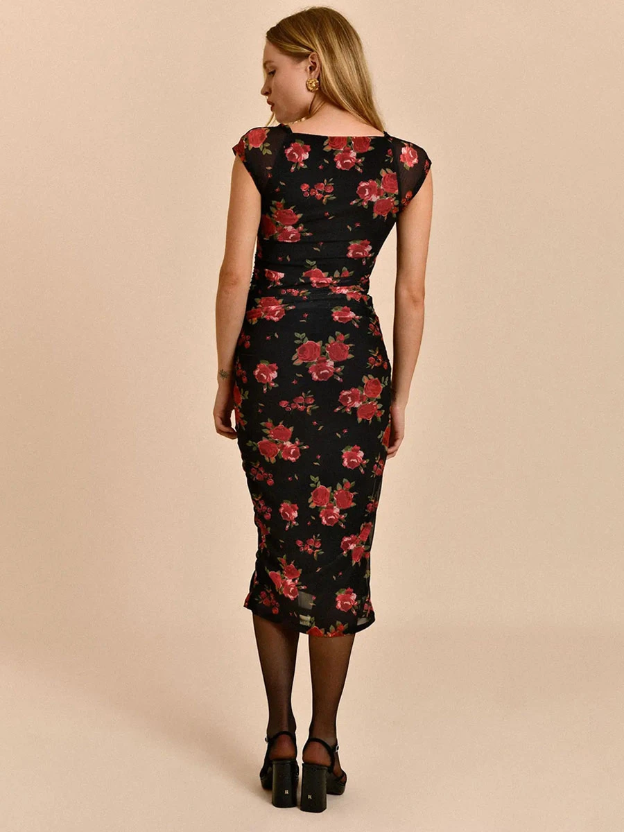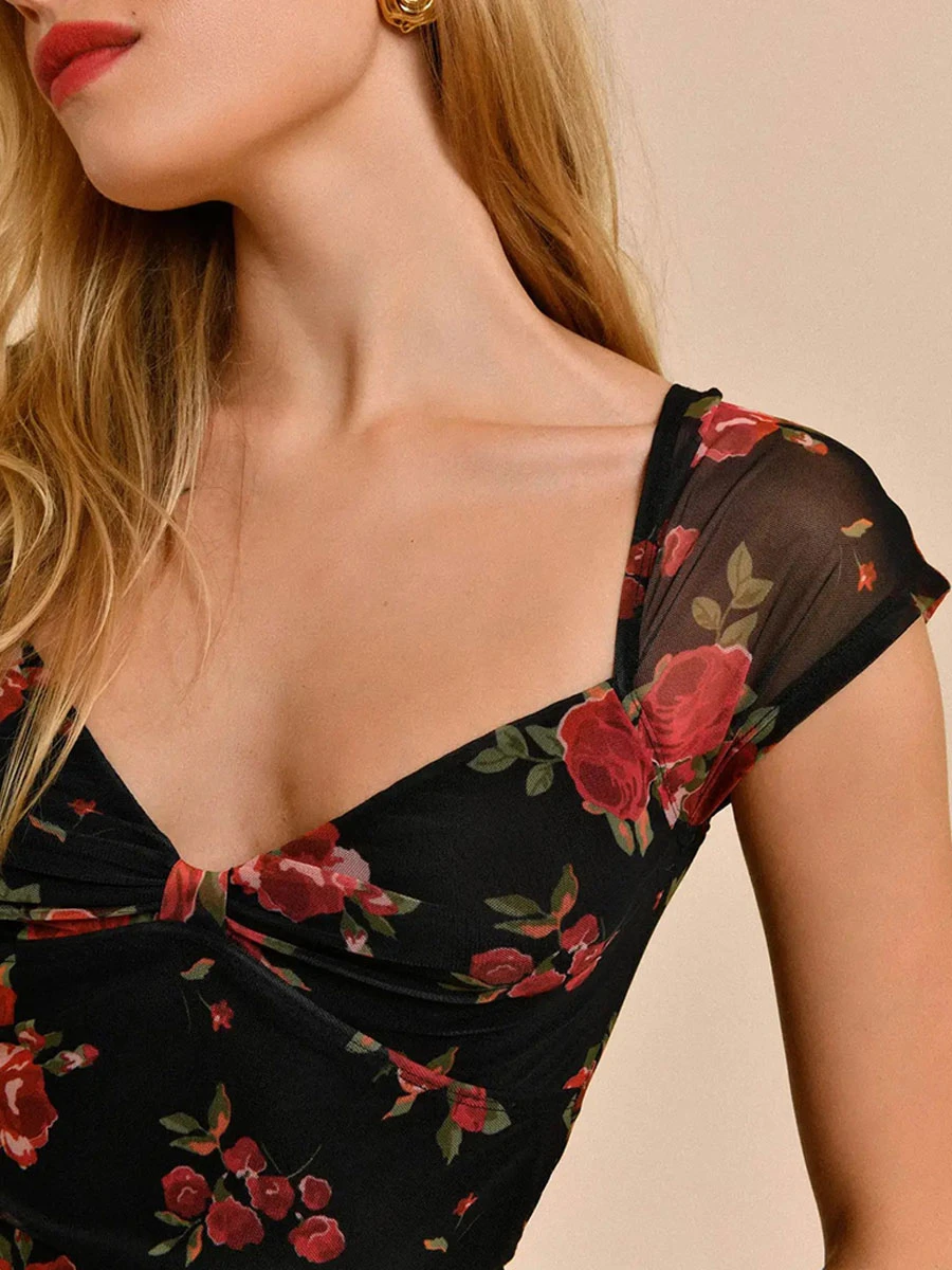 Be the first to review “Bodycon Dresses Floral Print Black Sweetheart Neck Pleated Stretch Sexy Short Sleeves Pencil Dress” Cancel reply