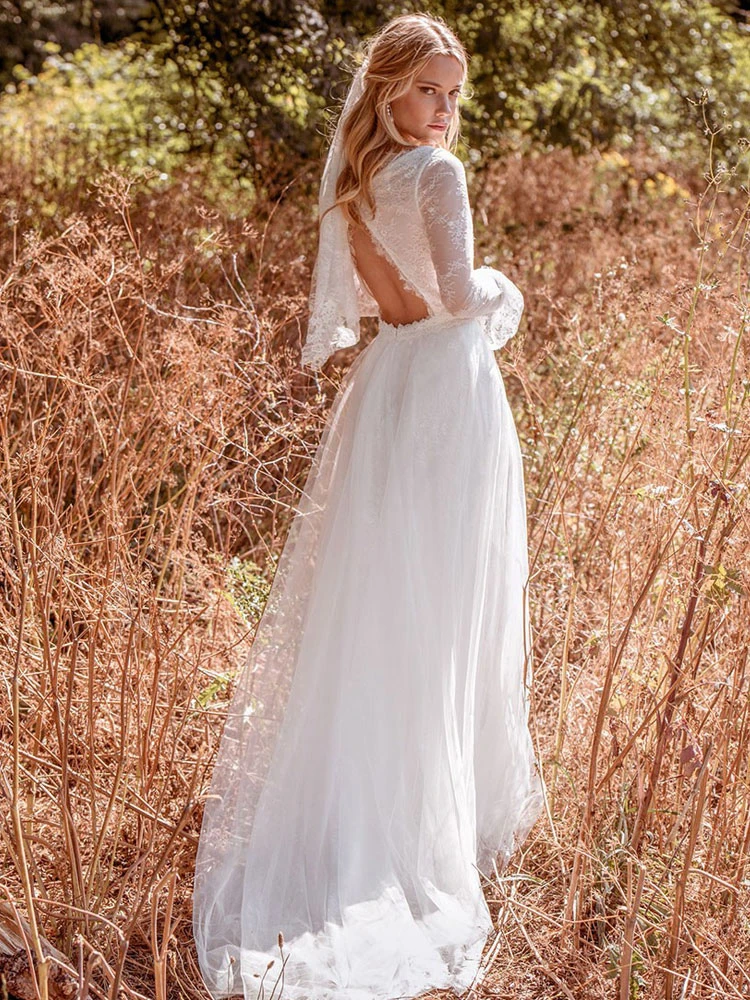 Boho Wedding Dress Lace A-Line With Train Backless Long Sleeves V-Neck White Hippie Bridal Dresses Free Customization