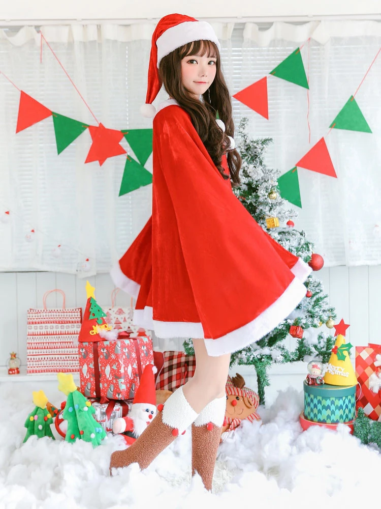 Christmas Costume Santa Claus Red Women Long Sleeve Dress And Hat Halloween