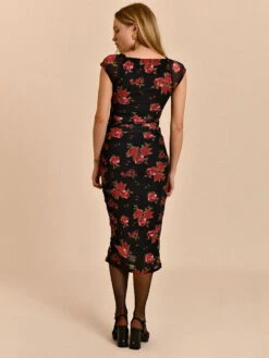 Bodycon Dresses Floral Print Black Sweetheart Neck Pleated Stretch Sexy Short Sleeves Pencil Dress
