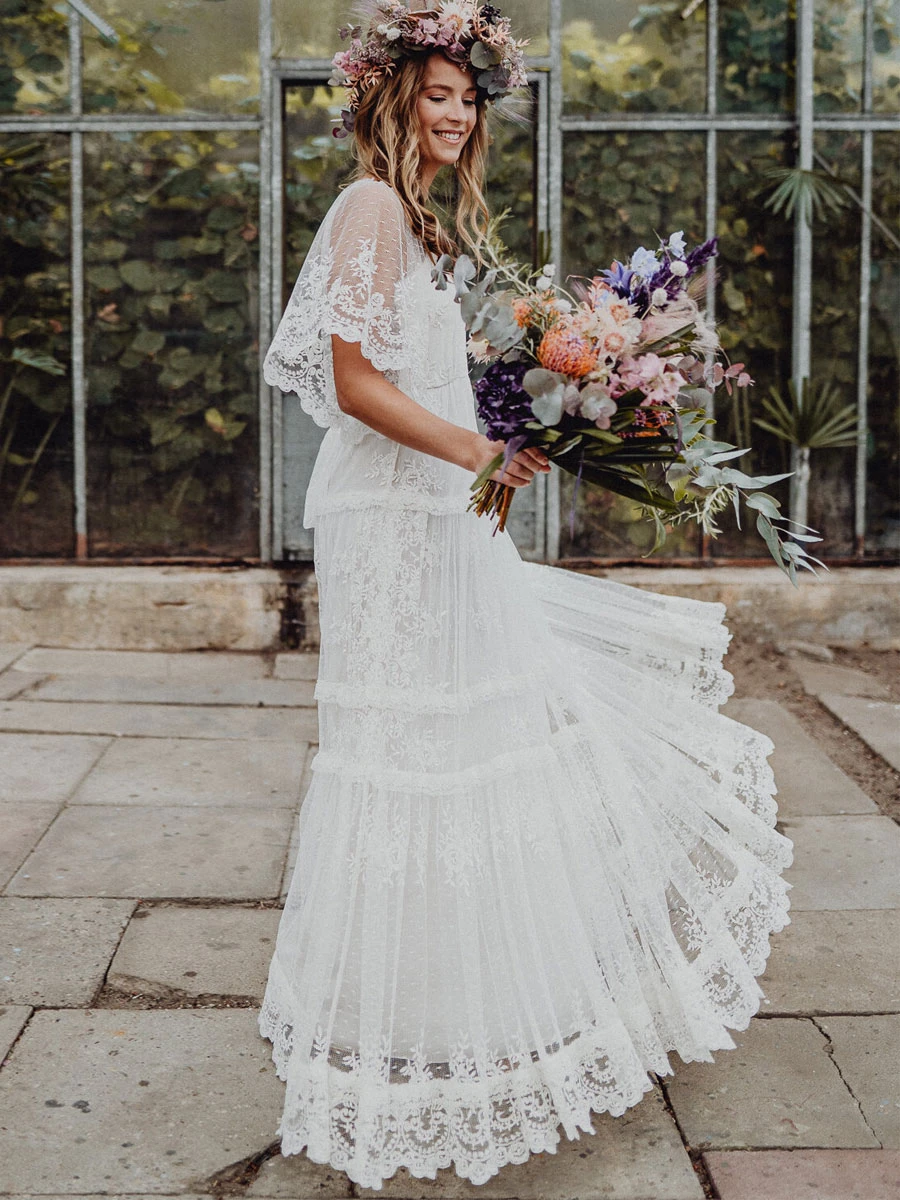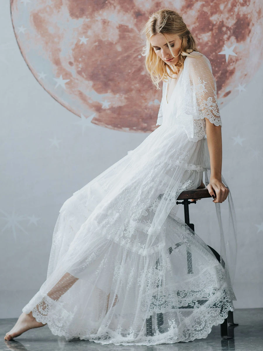 Ecru White Boho Wedding Dress Lace A-Line Floor-Length Backless Short Sleeves V-Neck Bridal Dress Free Customization