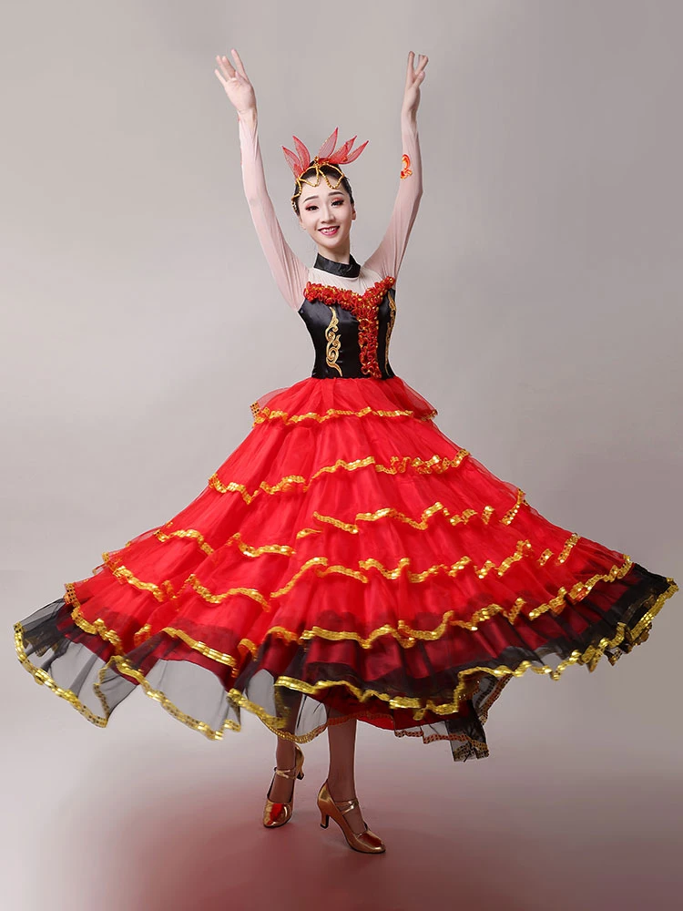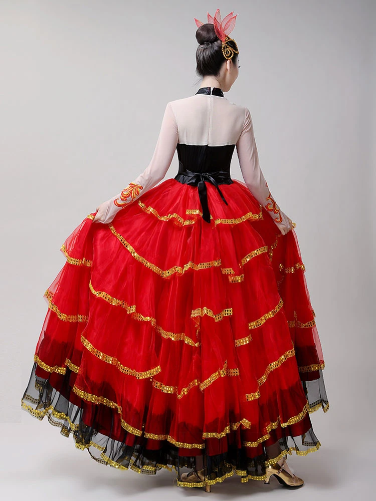 Flamenco Girls Yellow Long Sleeves Mesh Billowing Dancing Skirt Adults Spanish Dancer Ballroom Dress Paso Doble Costumes Carnival
