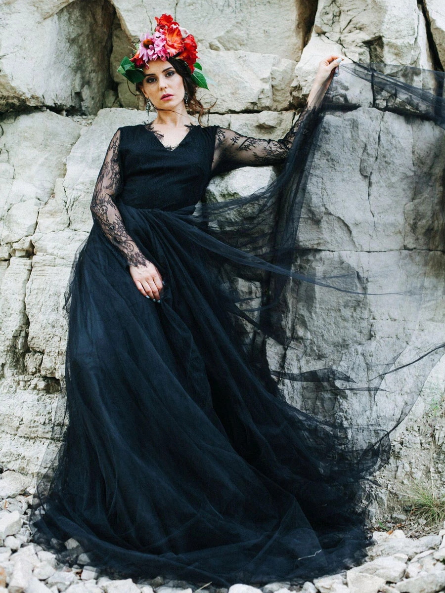 Be the first to review “Gothic Black Wedding Dresses A-Line Long Sleeves Backless Lace Up With Train Lace Bridal Gown Free Customization” Cancel reply