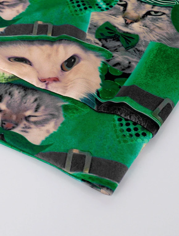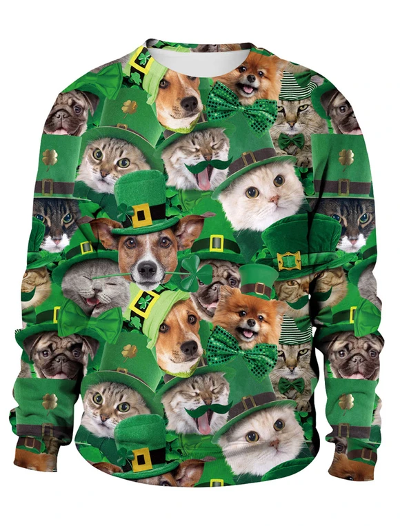 Green Sweatshirt St Patricks Day 3D Printed Dog Cat Clover Pullover Unisex Irish Long Sleeve Top Halloween