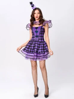 Halloween Joker Costumes For Women Purple Two-Tone Plaid Pattern Sexy Dress Hat Polyester Holidays Costumes Full Set