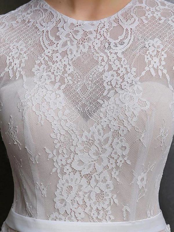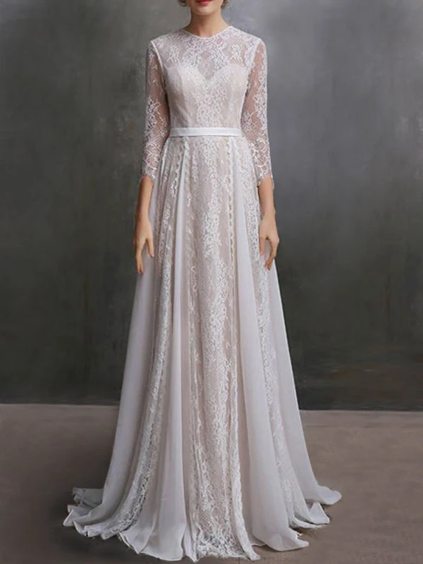 Ivory Lace Wedding Dress With Train A-Line Long Sleeves Chiffon Jewel Neck Bridal Gowns Free Customization