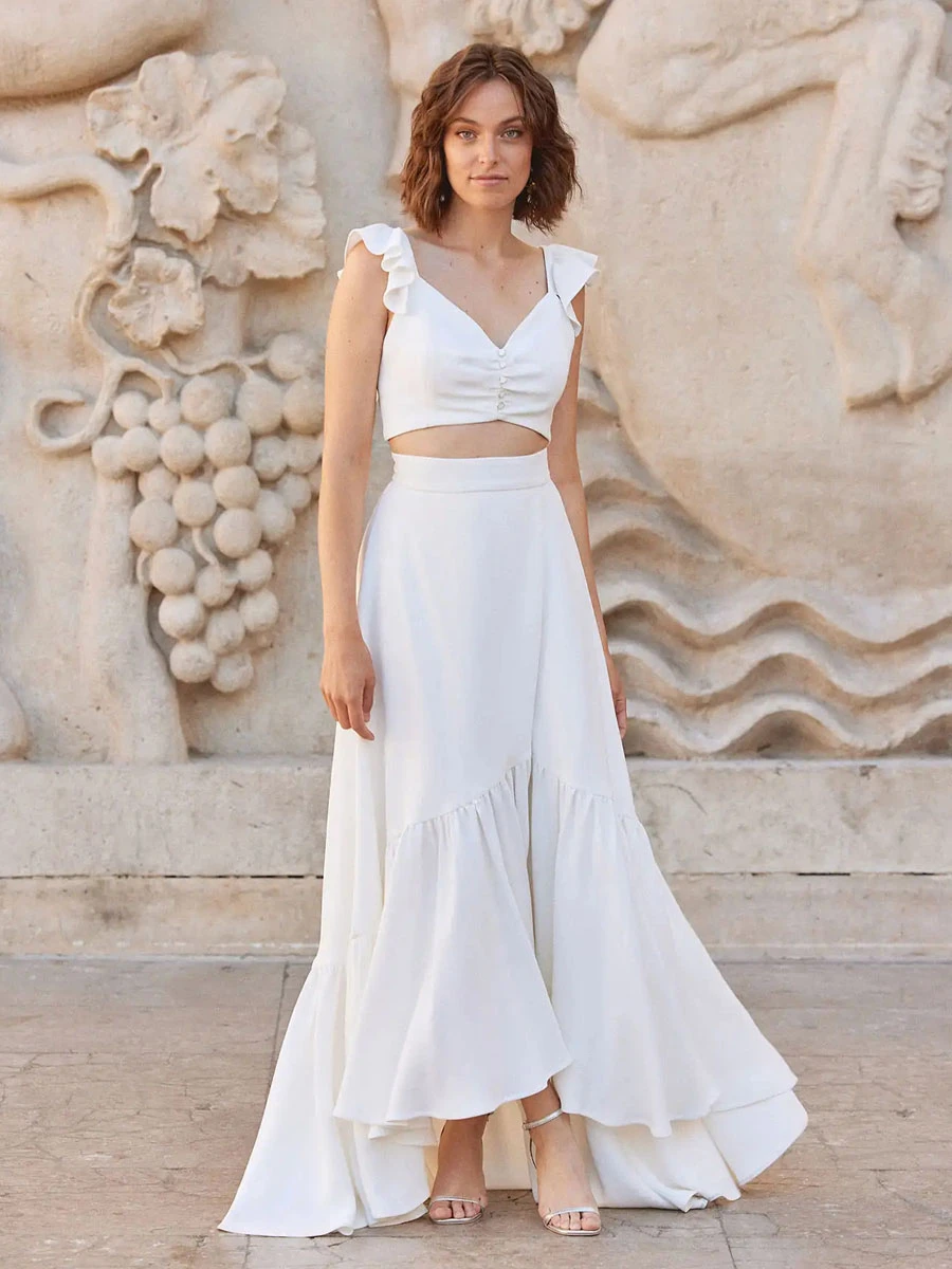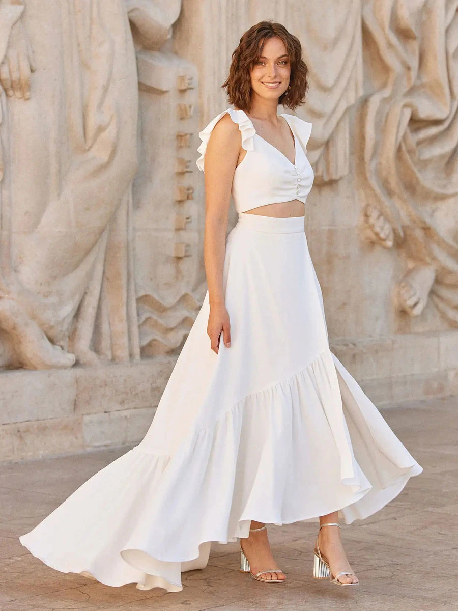 Ivory Two-piece Wedding Dress Satin Fabric Buttons V-Neck A-Line Ankle-Length Backless Sleeveless Bridal Sets