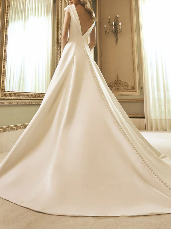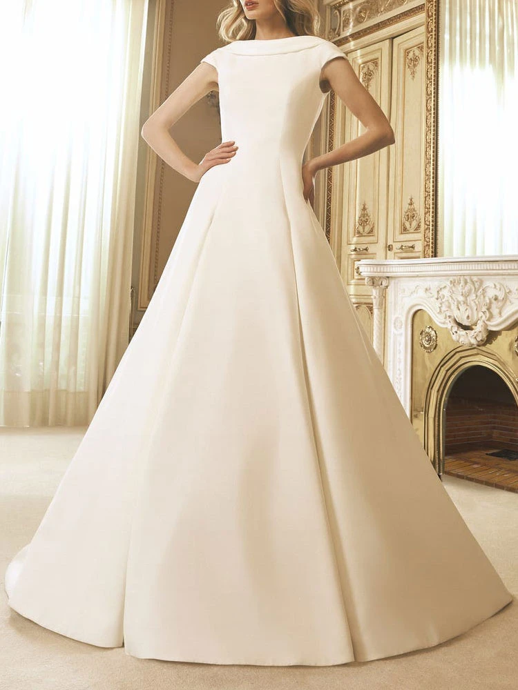 Ivory Vintage Plus Size Wedding Dresses Jewel Neck Short Sleeves Satin Fabric With Train Bridal Dress Free Customization
