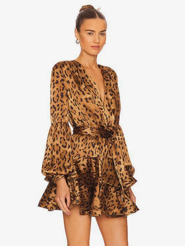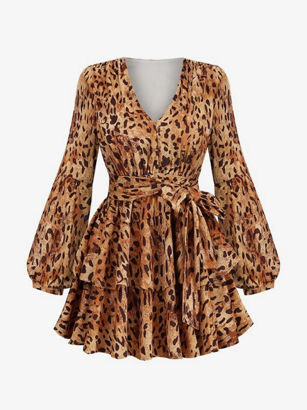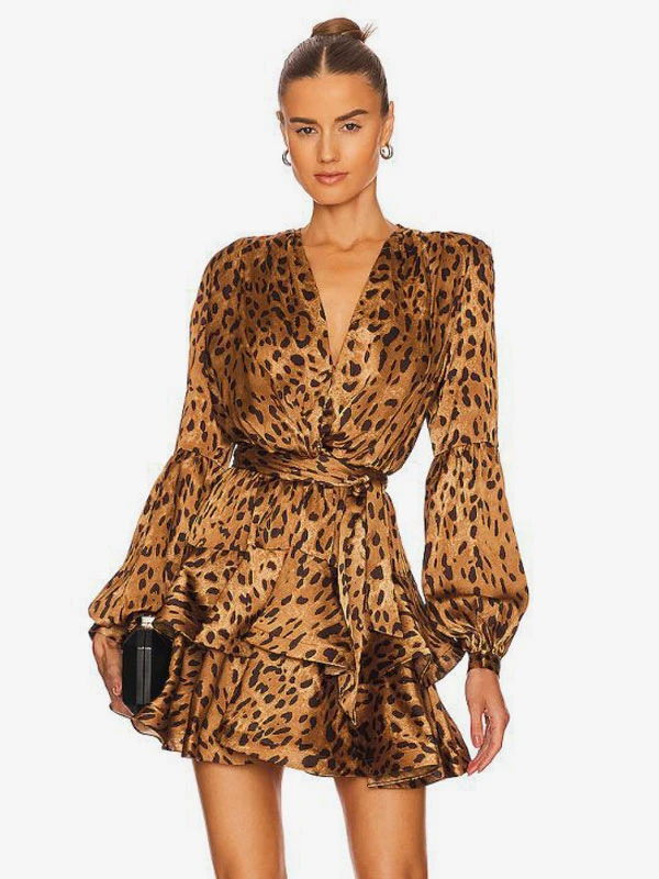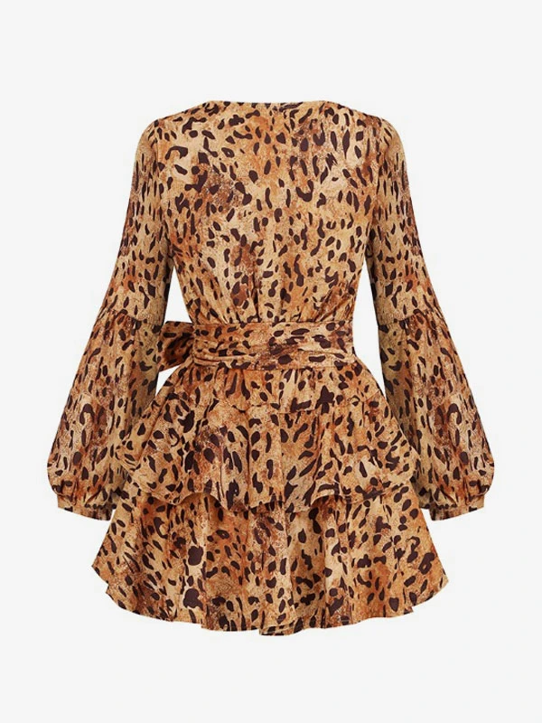 Leopard Party Dresses V-Neck Long Sleeves Birthday Mini Semi Formal Dress