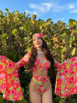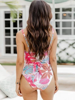 Women One Piece Swimsuits Red Mixed Floral Print Lace Up V-Neck Backless Summer Beach Swimwear