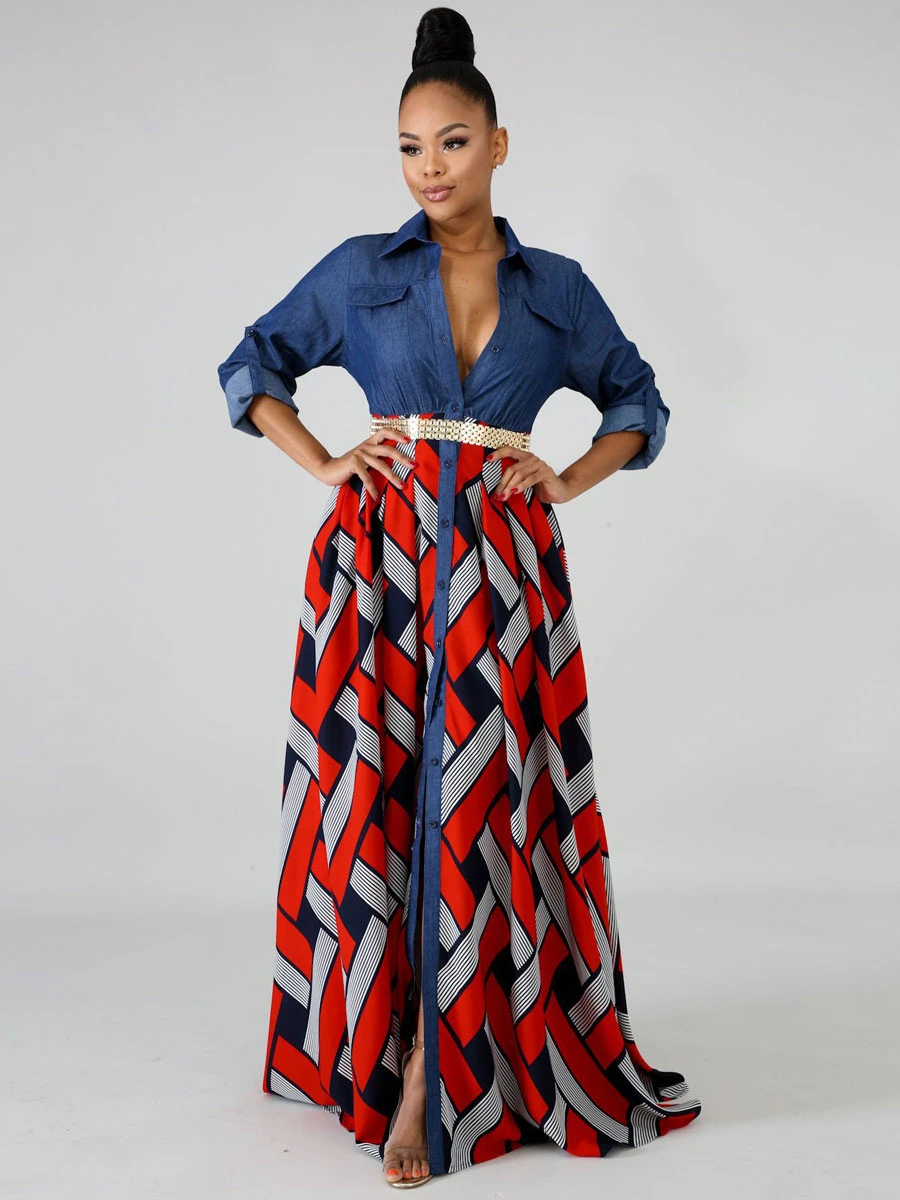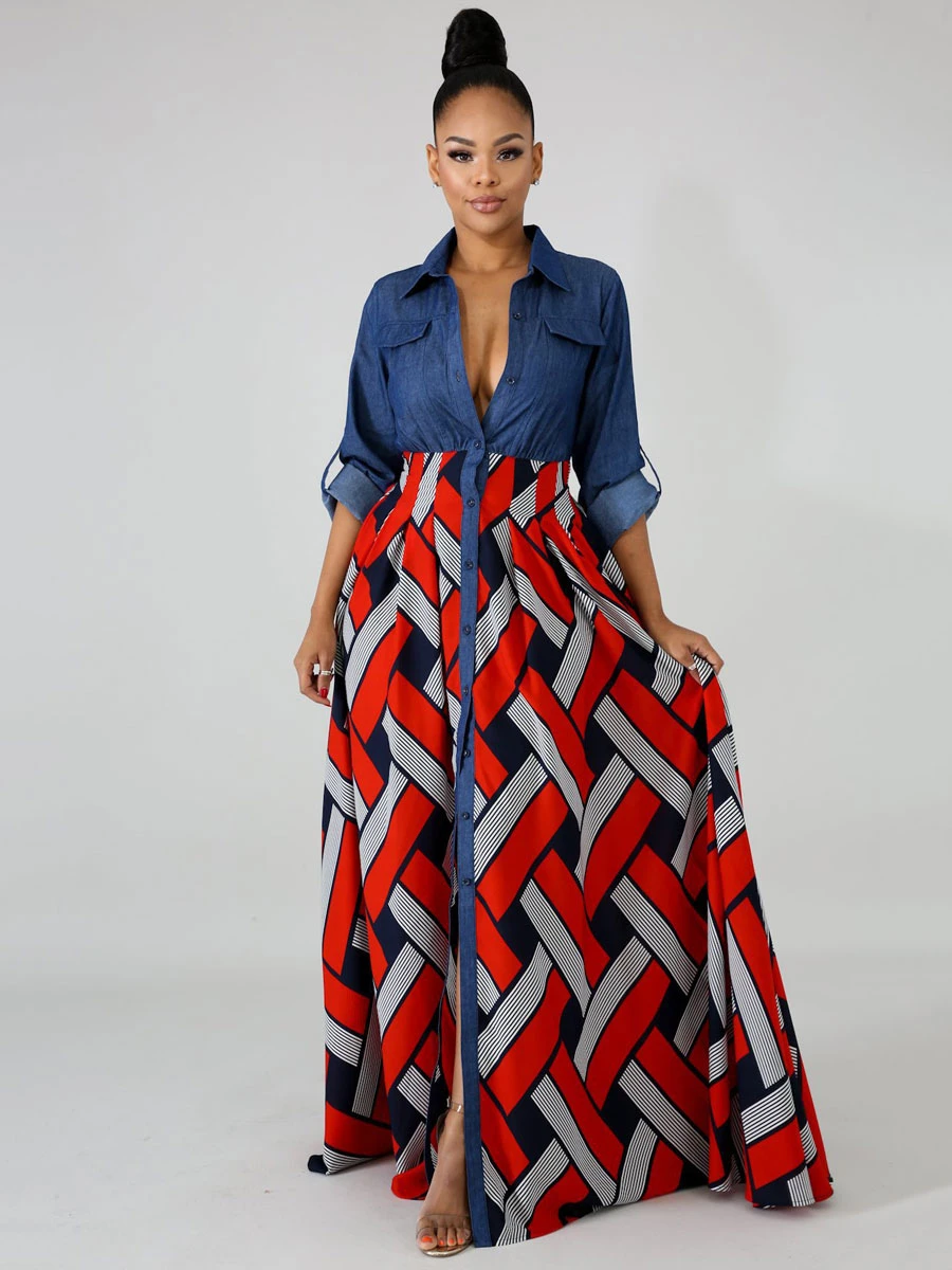 Red Maxi Dresses For Women Long Sleeves Printed V-Neck Lace Up Oversized Long Dress