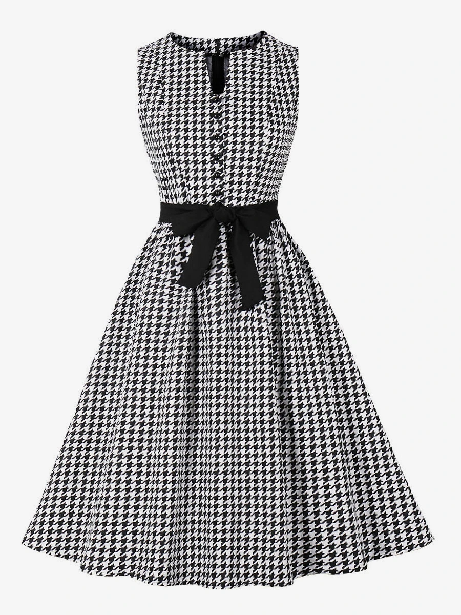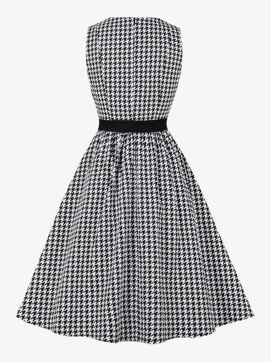 Retro Dress 1950s Audrey Hepburn Style Black Plaid Women Sleeveless Swing Dress