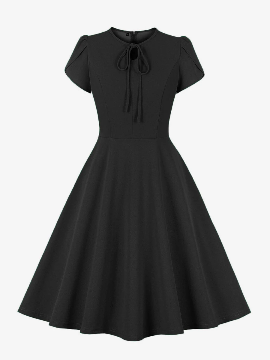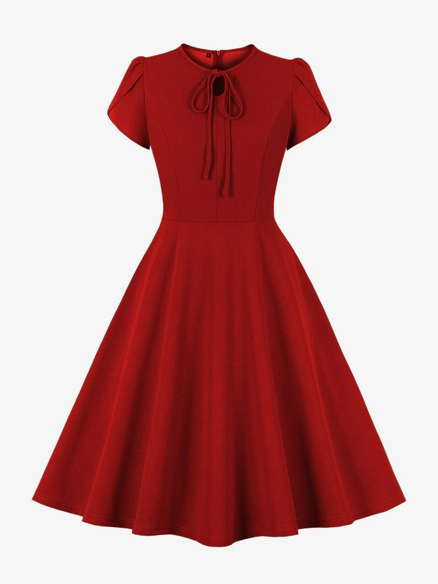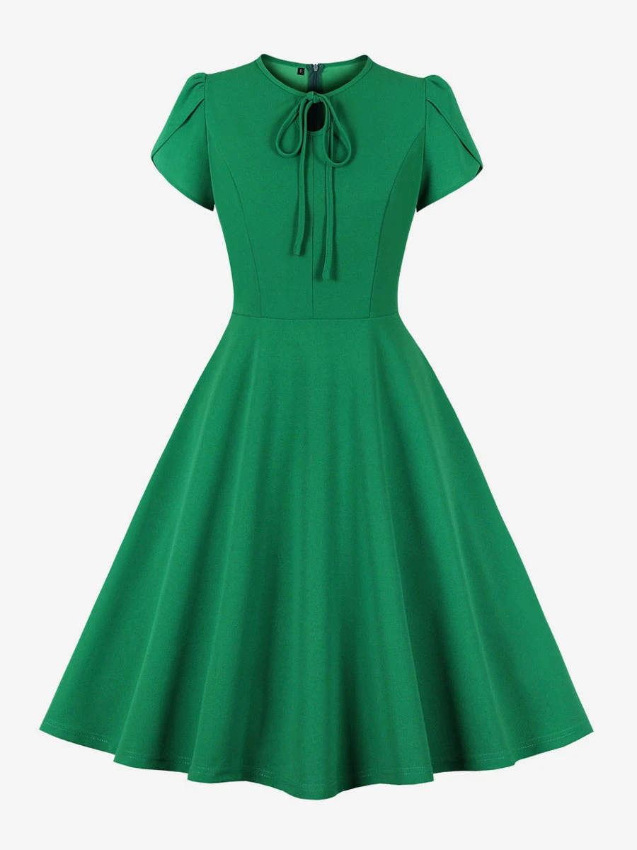 Retro Dress 1950s Audrey Hepburn Style Jewel Neck Lace Up Short Sleeves Knee Length Swing Dress