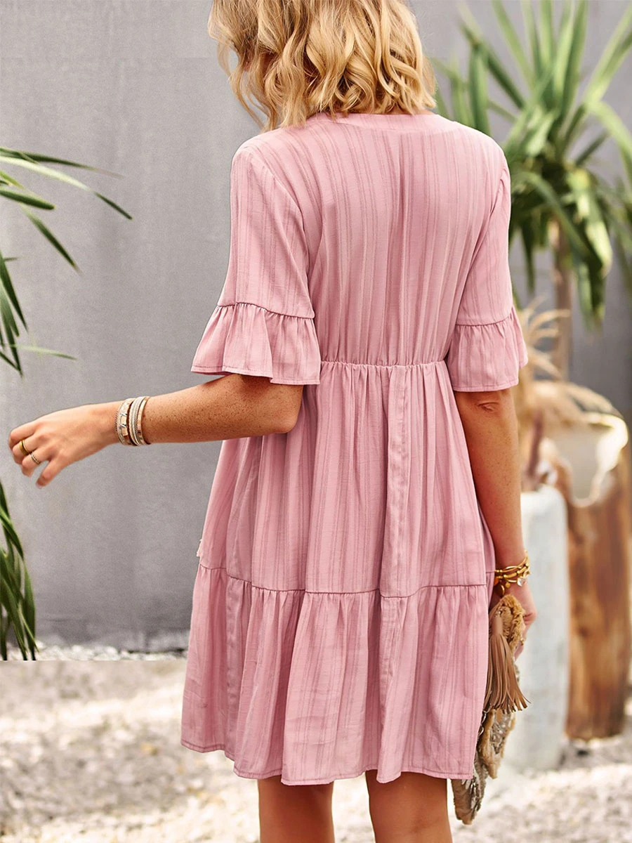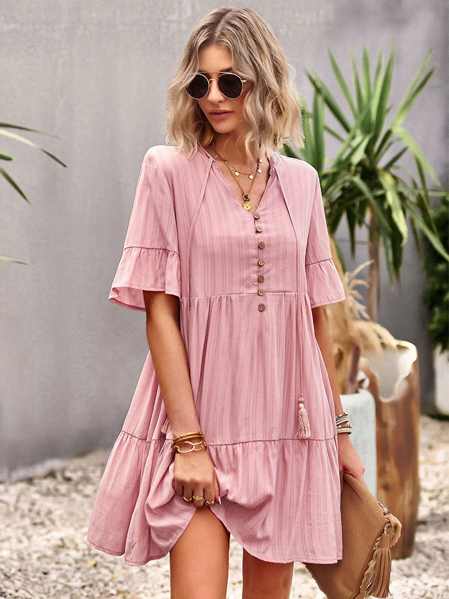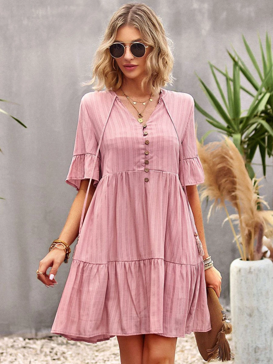 Shift Dresses Short Sleeves Casual Lace Up V-Neck Pink Tunic Dress