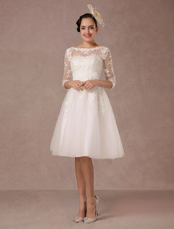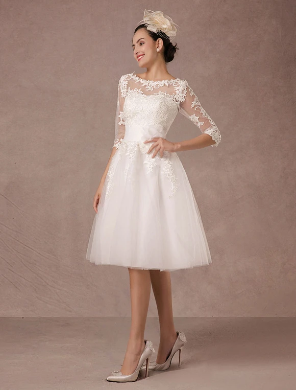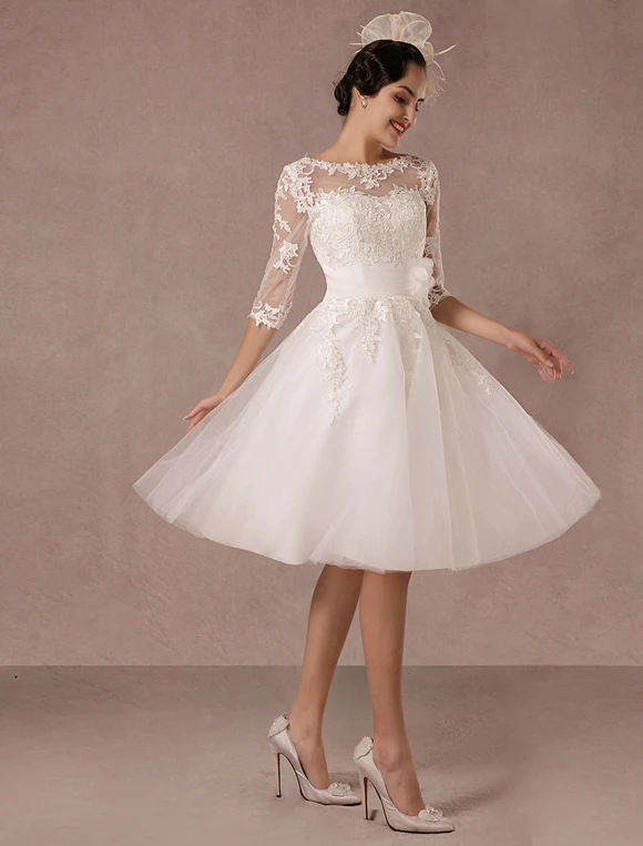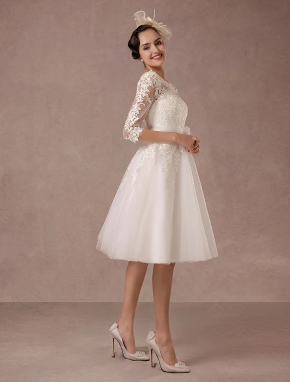Short Wedding Dress Vintage Lace Applique Long Sleeves Tea Length A-Line Tulle Bridal Gown With Flower Sash Free Customization