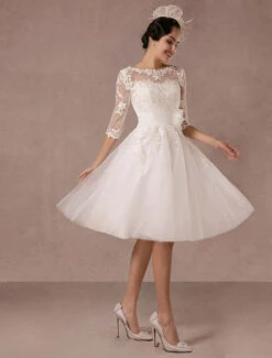 Be the first to review “Short Wedding Dress Vintage Lace Applique Long Sleeves Tea Length A-Line Tulle Bridal Gown With Flower Sash Free Customization” Cancel reply
