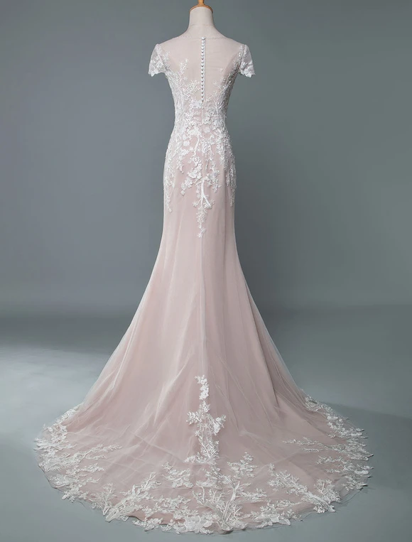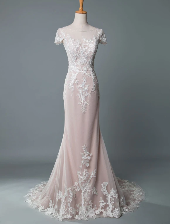Be the first to review “Simple Wedding Dress Mermaid Jewel Neck Short Sleeves Floor Length Lace Bridal Gowns With Train Free Customization” Cancel reply