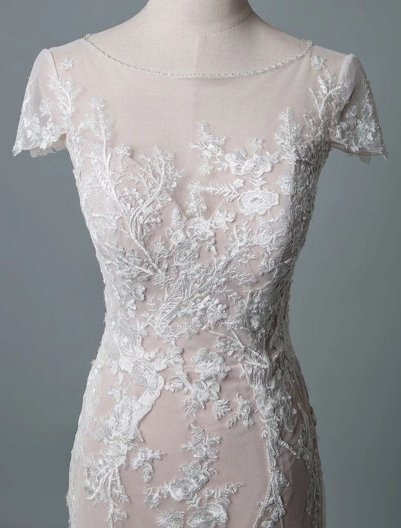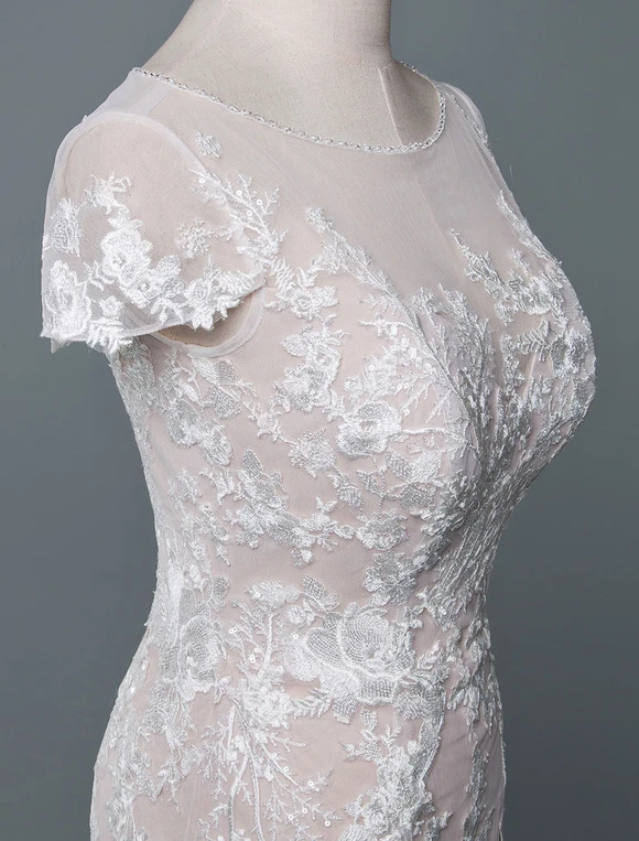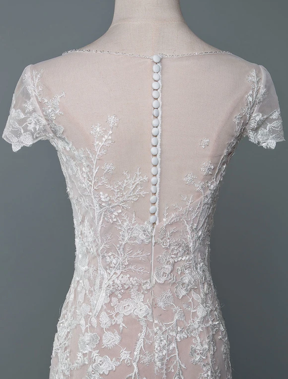 Simple Wedding Dress Mermaid Jewel Neck Short Sleeves Floor Length Lace Bridal Gowns With Train Free Customization