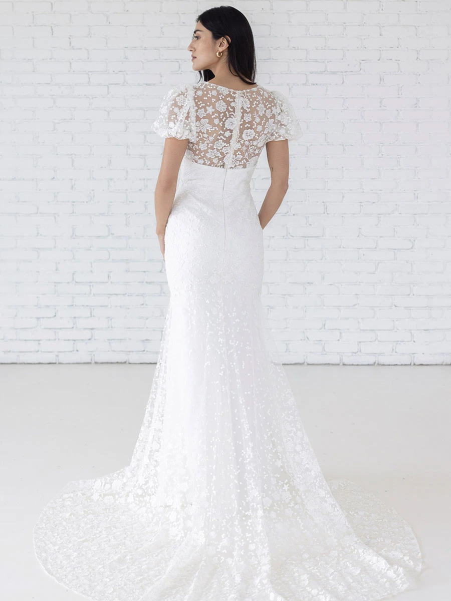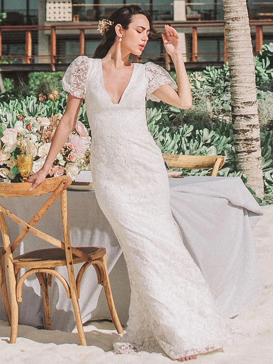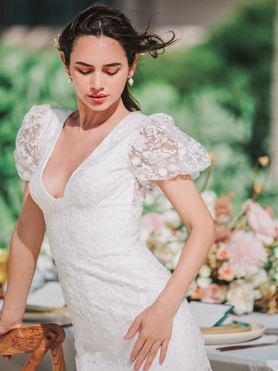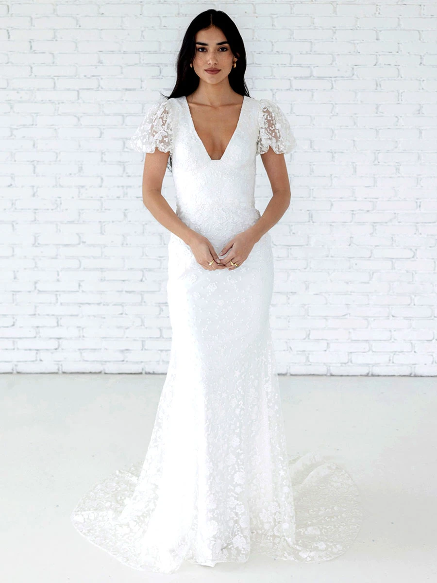 Simple Wedding Dress Mermaid V-Neck Short Sleeves Lace Bridal Dresses Free Customization