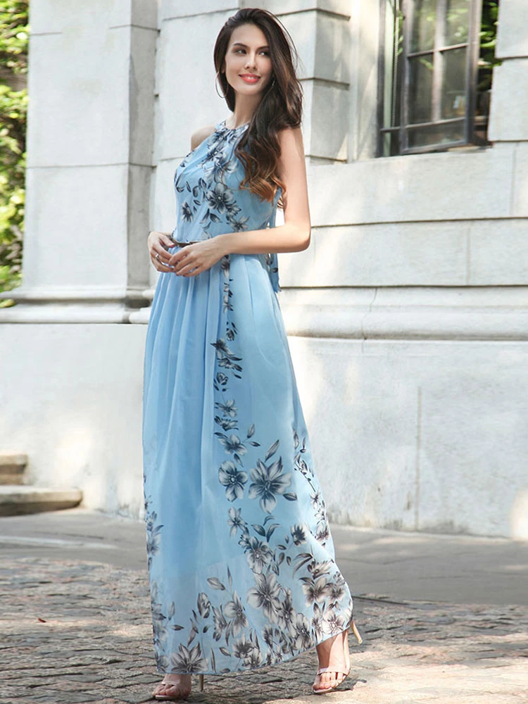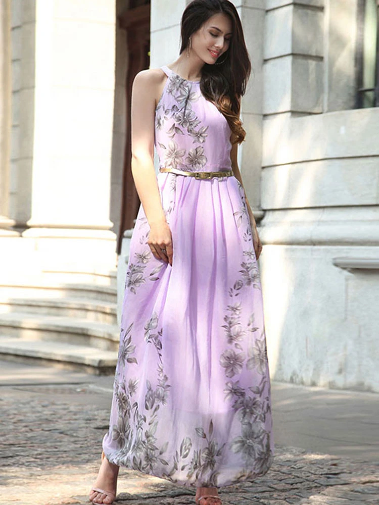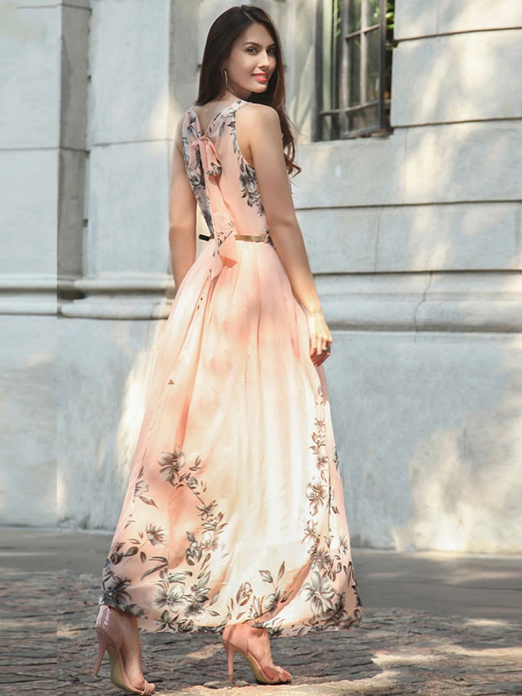 Summer Dress Floral Print Pink Long Beach Dress