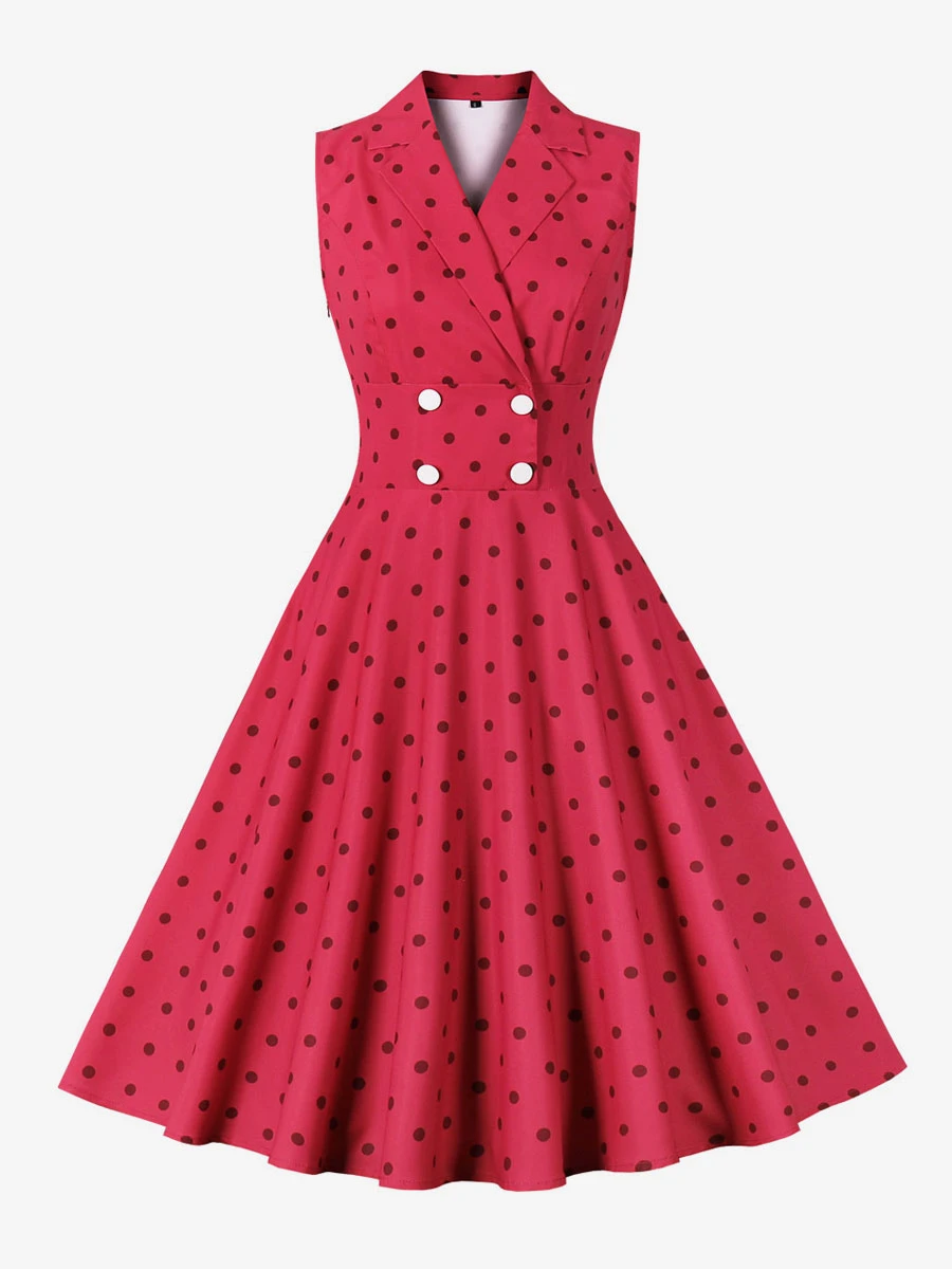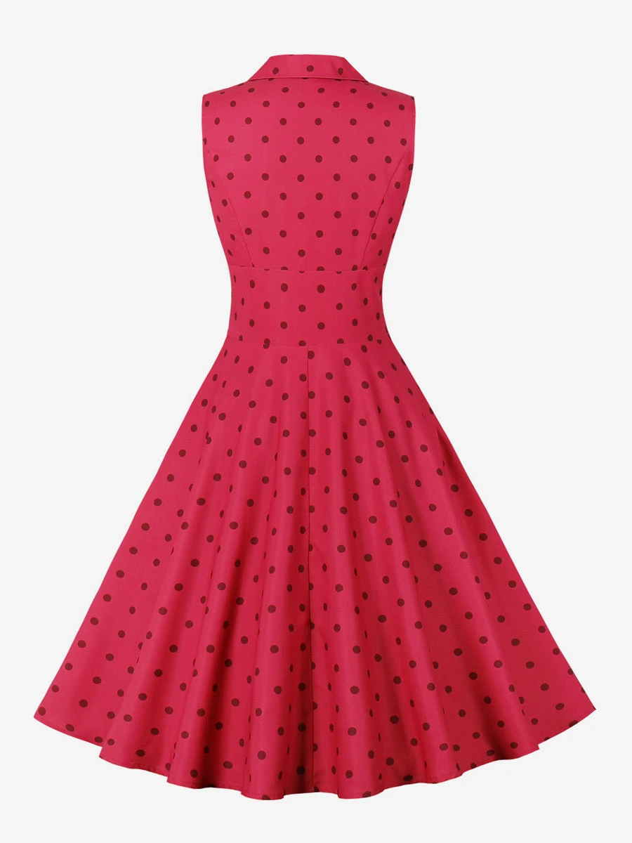 Vintage Dress 1950s Audrey Hepburn Style V-Neck Sleeveless Polka Dot Knee Length Swing Dress