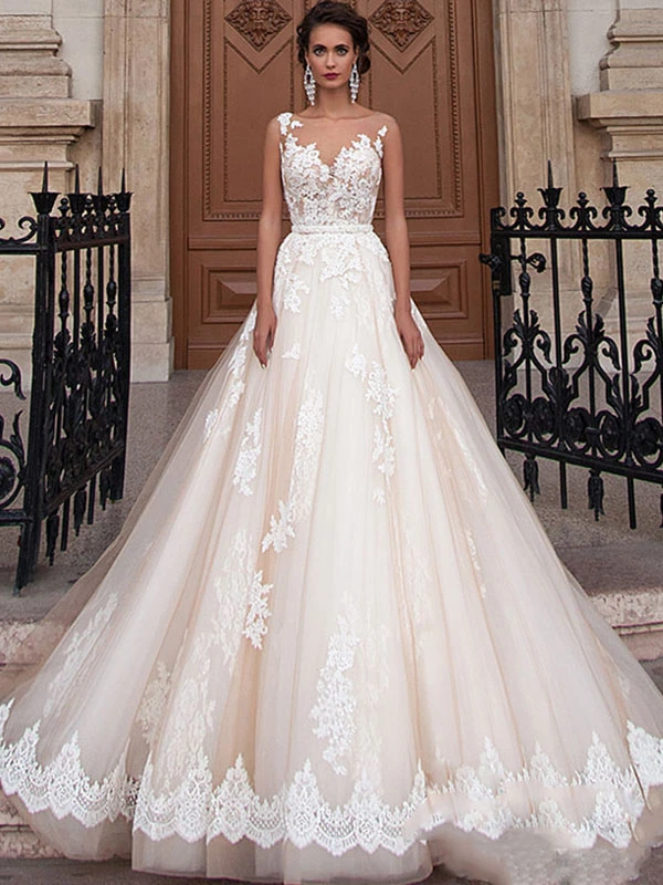 Wedding Dresses 2023 Jewel Illusion Neck Sleeveless A Line Lace Flora Applique Bridal Gowns With Train