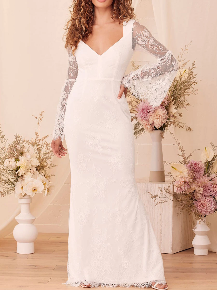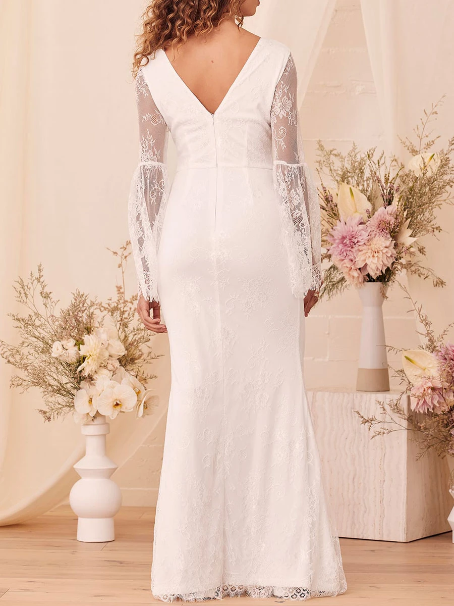 White Mermaid Engagement Dress 2023 V-Neck Long Sleeves Backless Floor Length A-Line Lace Cheap Bridal Dress Free Customization