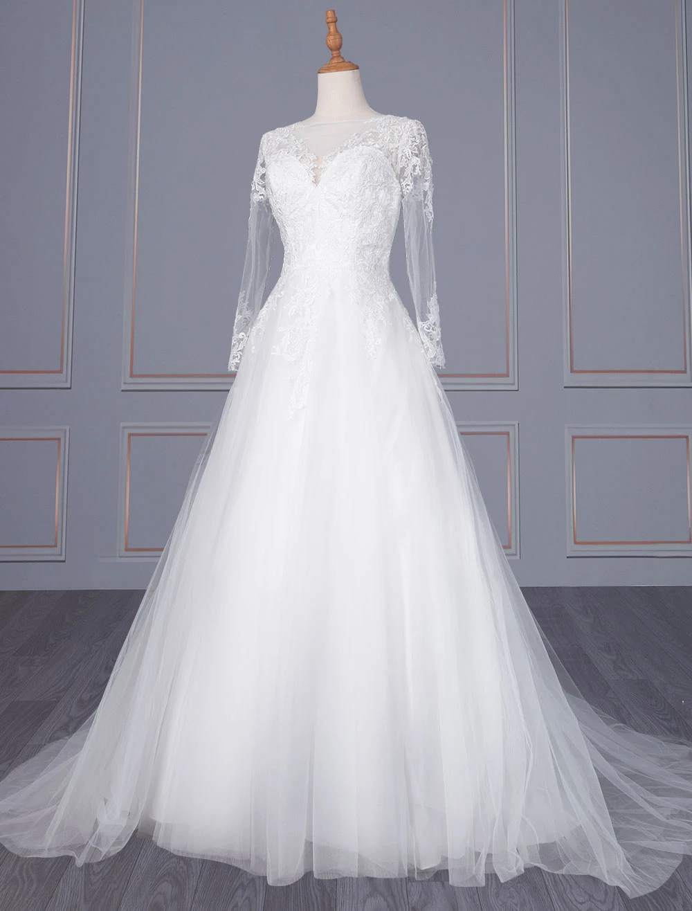White Simple Wedding Dress A-Line V-Neckline Long Sleeves Zipper Lace Tulle Bridal Dresses Free Customization