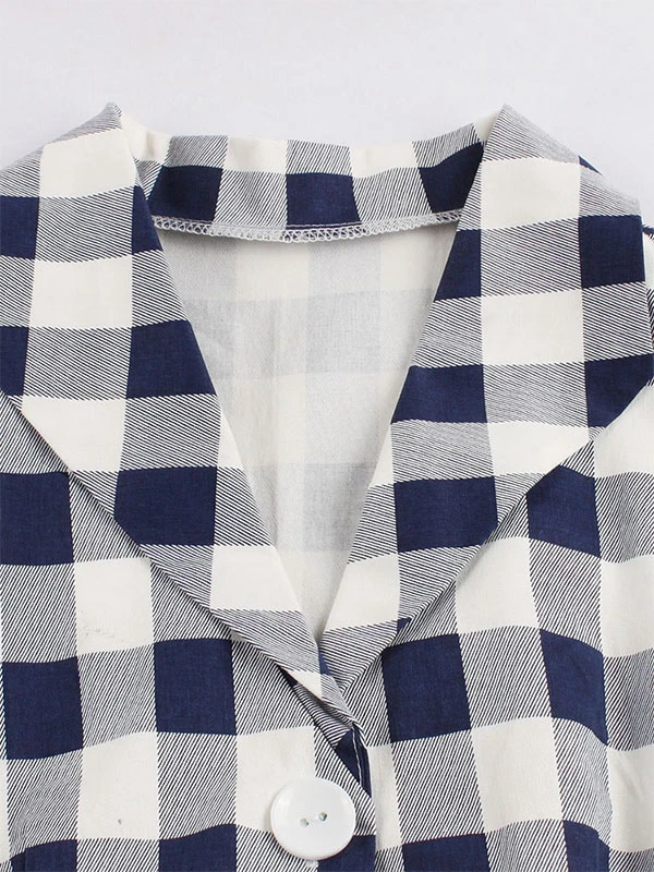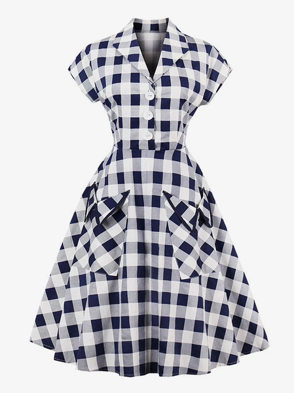 White Vintage Dresses V Neck Short Sleeve Checkered A Line Midi Dress For Women