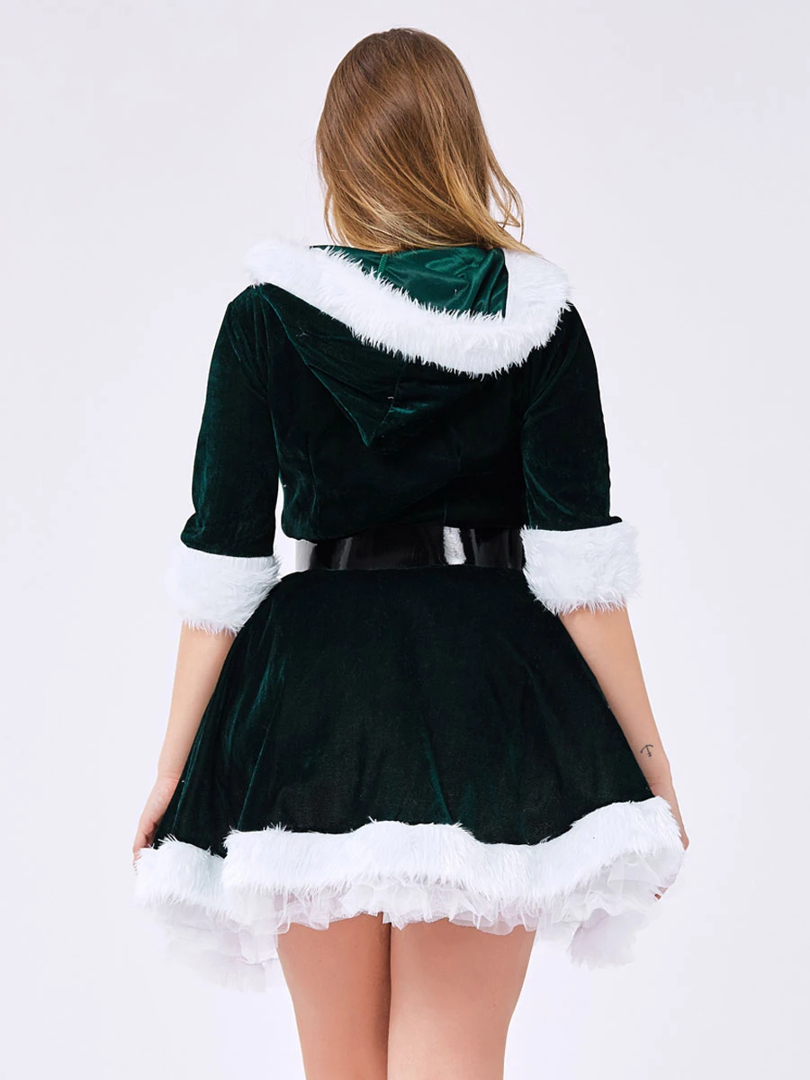 Women Christmas Costume V Neck Furry Velour Skater Dress Dark Green Holidays Costumes