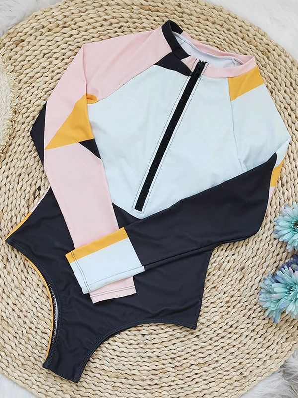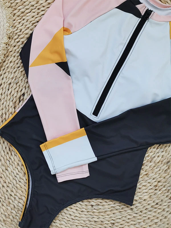Women One Piece Swimsuits Black Color Block Zipper Jewel Neck Layered Summer Beach Bathing Suits