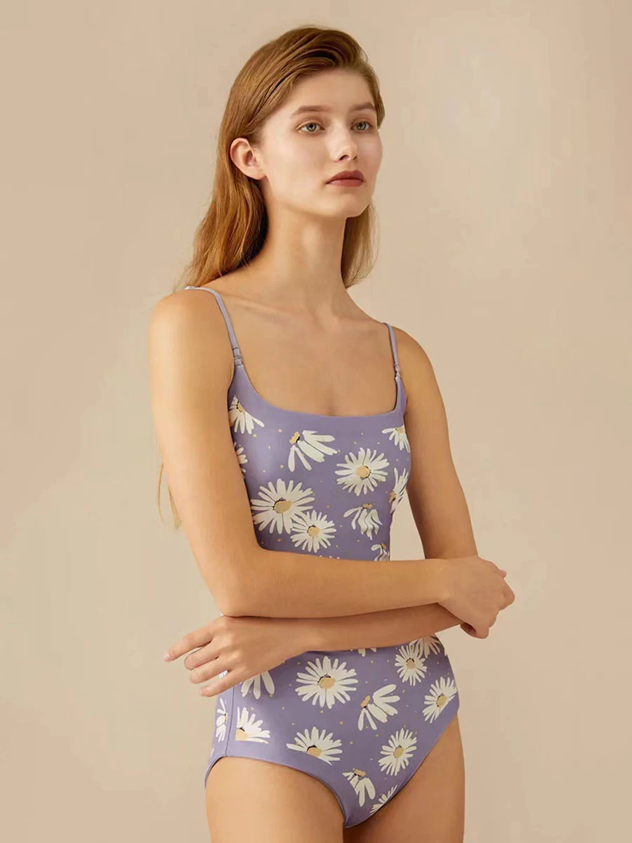 Women One Piece Swimsuits Blue Mixed Floral Print U-Neck Convertible Summer Sexy Swimming Suits