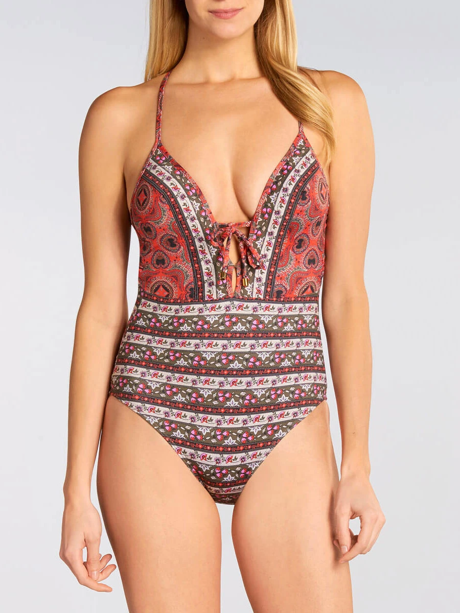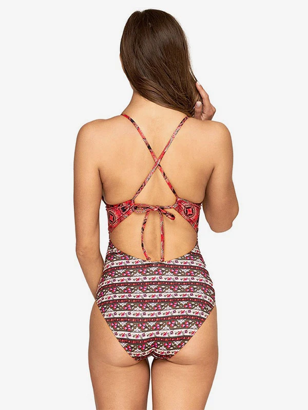 Women One Piece Swimsuits Red Mixed Floral Print Lace Up V-Neck Backless Summer Beach Swimwear
